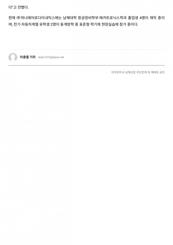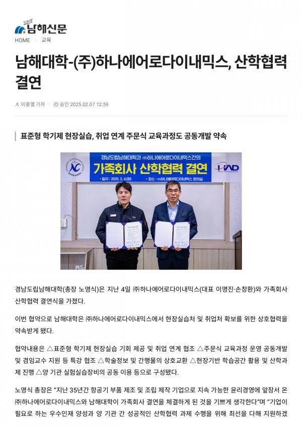 (주)하나에어로다이내믹스 - 남해대학, 산학협력 결연 페이지 정보 작성자 최고관리자 댓글 0건 조회 67회 작성일 25-12-15 08:57 목록 본문 다음글하나에어로다이내믹스 700만 달러 수출의 탑 수상 25.12.12